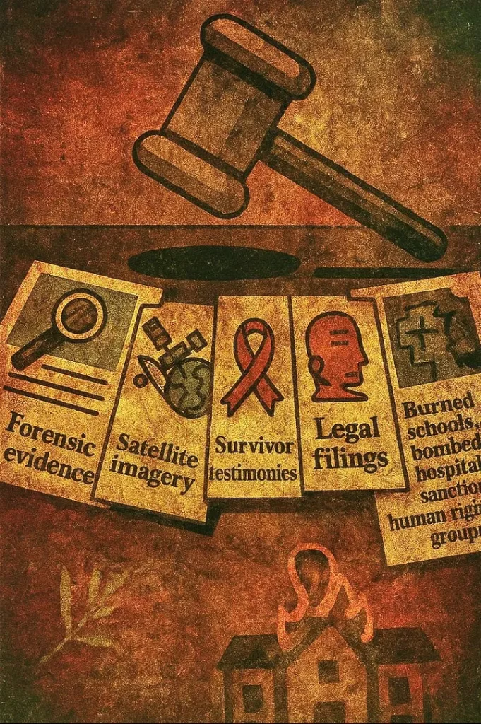 El archivo construido en tiempo real —imágenes de escombros, testimonios de sobrevivientes, evidencia obtenida clandestinamente a través de la censura— no es un memorial en construcción, sino la base del proceso judicial.